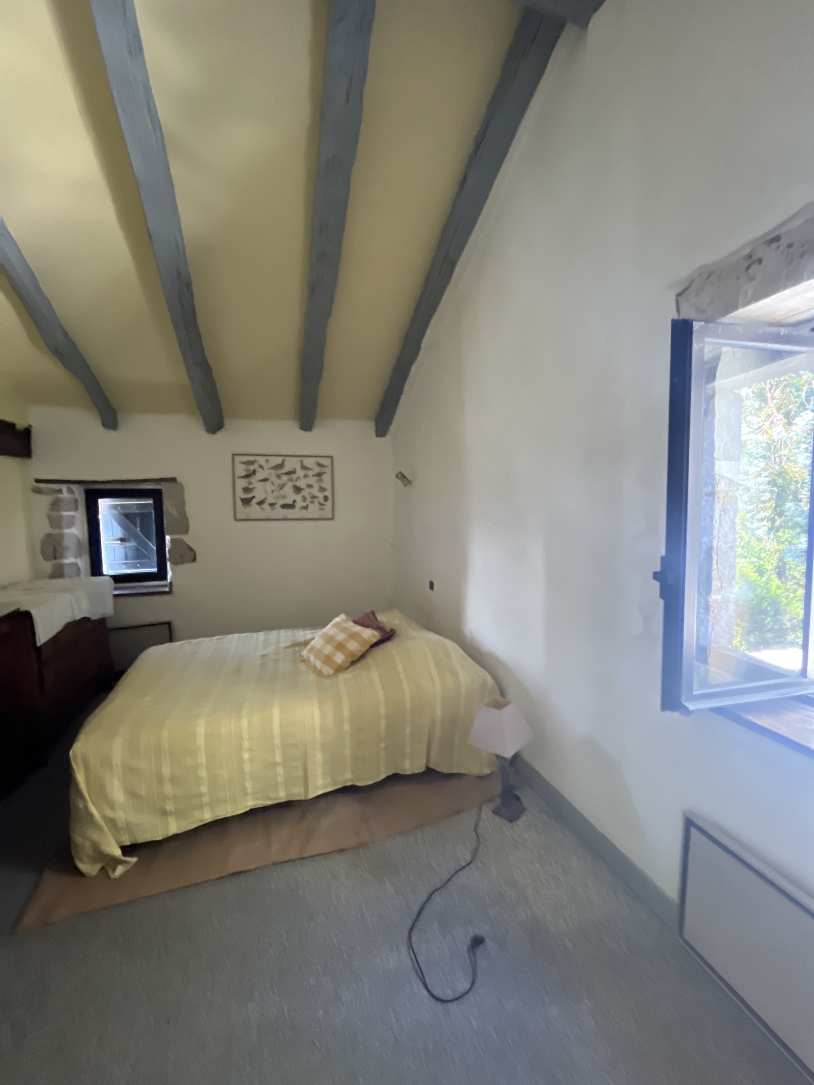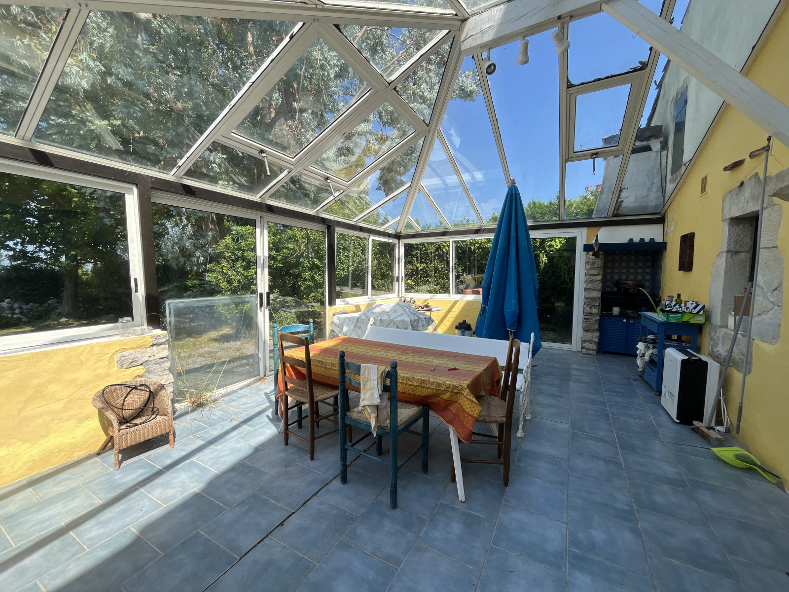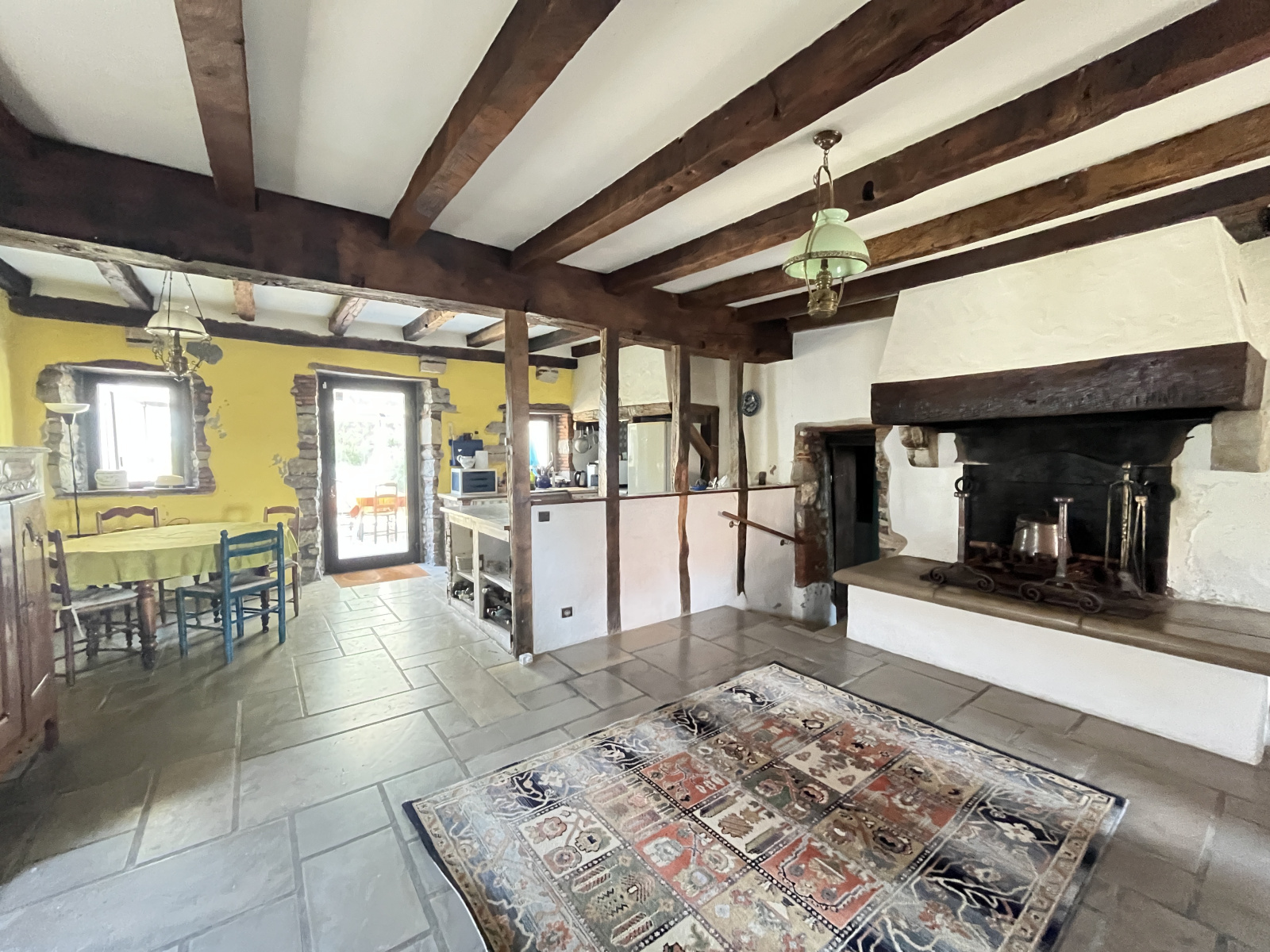 Au rez-de-chaussée : salon avec cheminée, séjour lumineux, cuisine donnant sur une véranda d’environ 30 m² (à rénover), une chambre spacieuse de 15 m², salle de bains de 8 m² et WC indépendant. À l’étage, trois chambres supplémentaires et une seconde salle de bains. Un atelier de 28 m² et un jardin avec vue dégagée complètent l’ensemble.