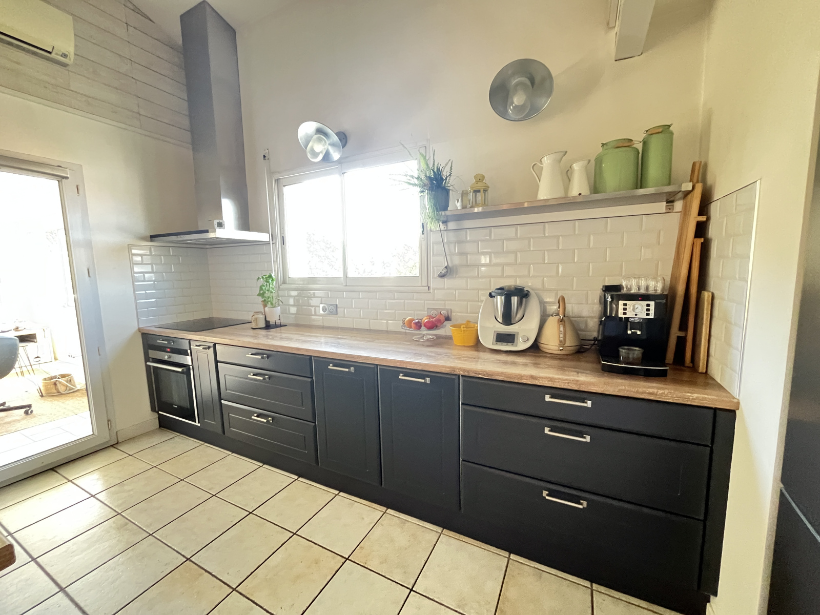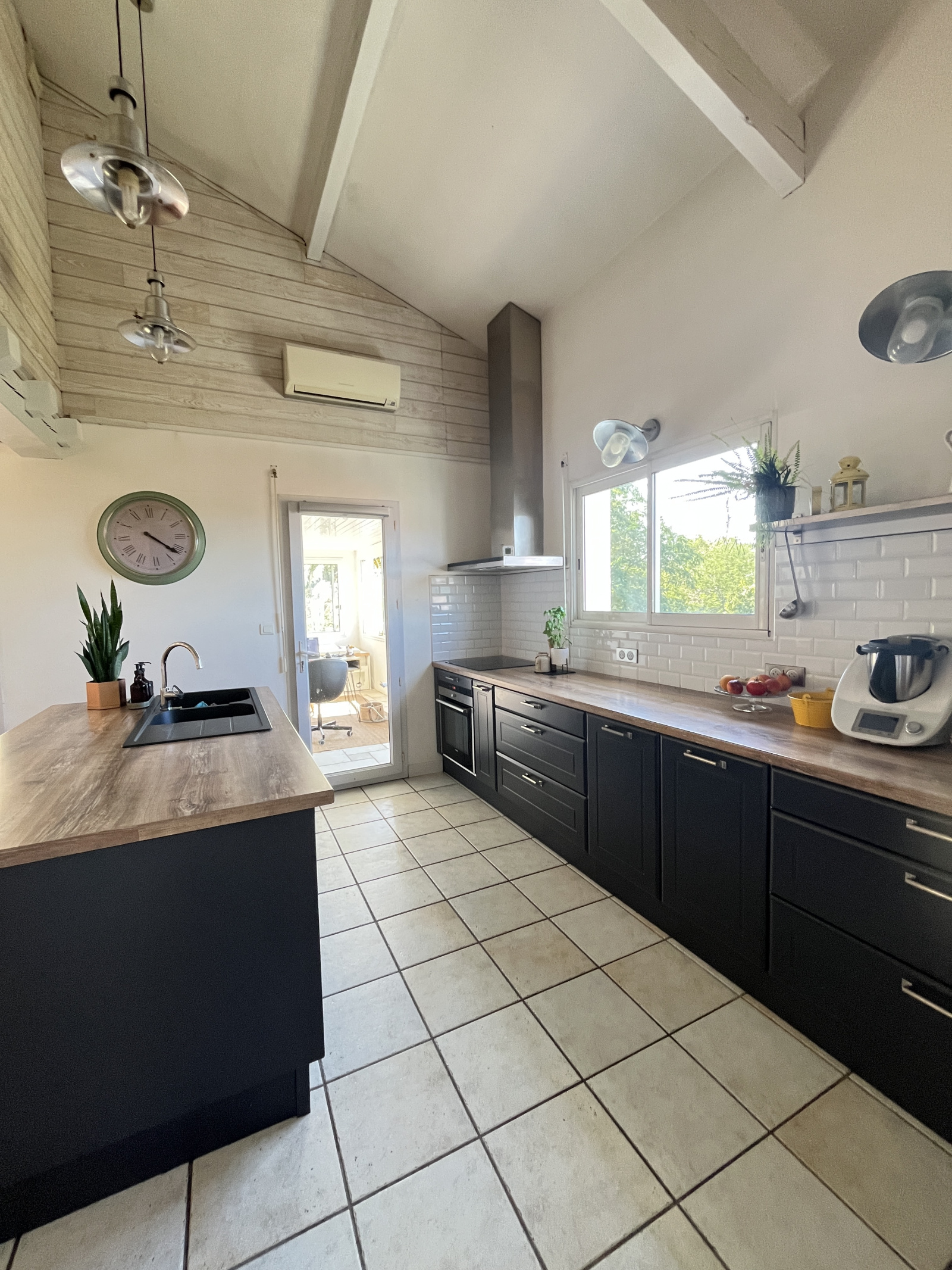 La cuisine ouverte, fonctionnelle et conviviale, est complétée par une arrière-cuisine offrant de nombreux rangements.