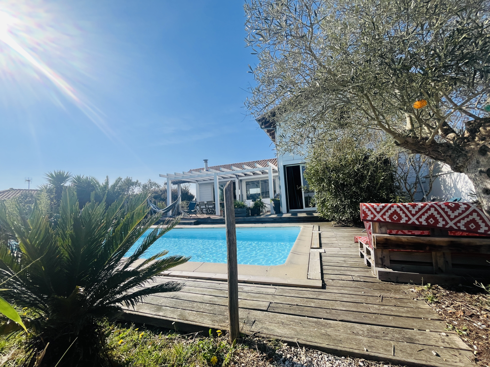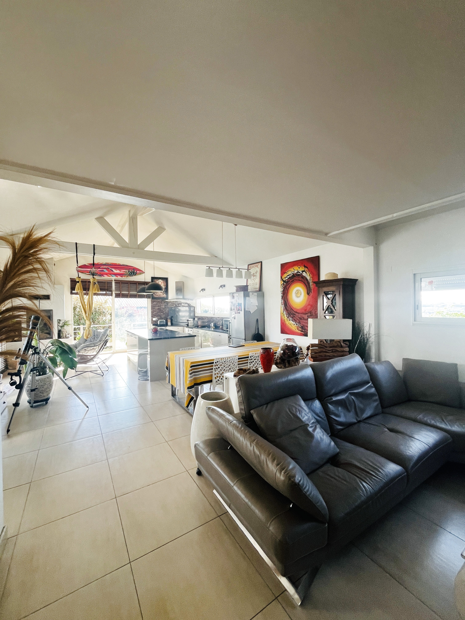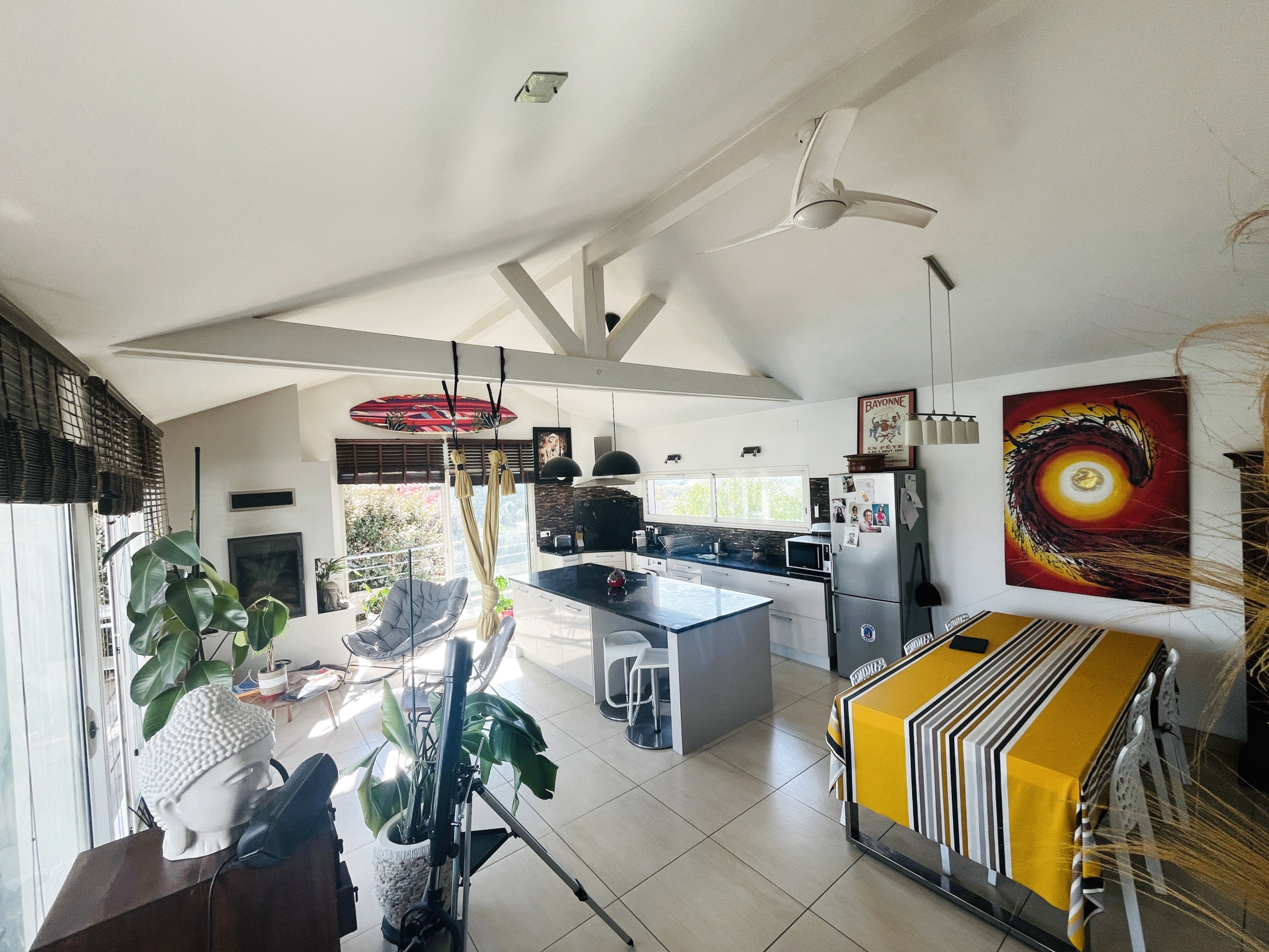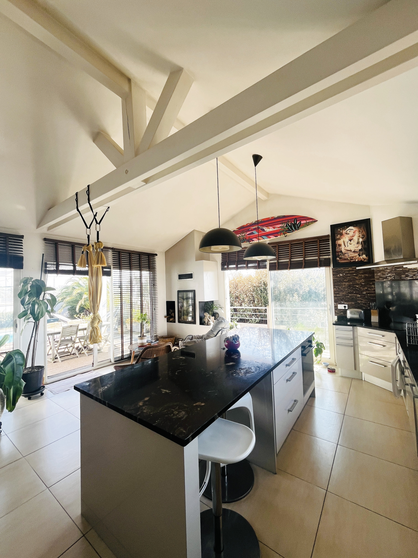 La maison principale, d’environ 122 m², s’organise autour d’une superbe pièce de vie de plus de 62 m², baignée de lumière grâce à son exposition plein sud et largement ouverte sur l’extérieur et le panorama. La cuisine américaine, entièrement équipée, prolonge harmonieusement cet espace convivial et résolument moderne.