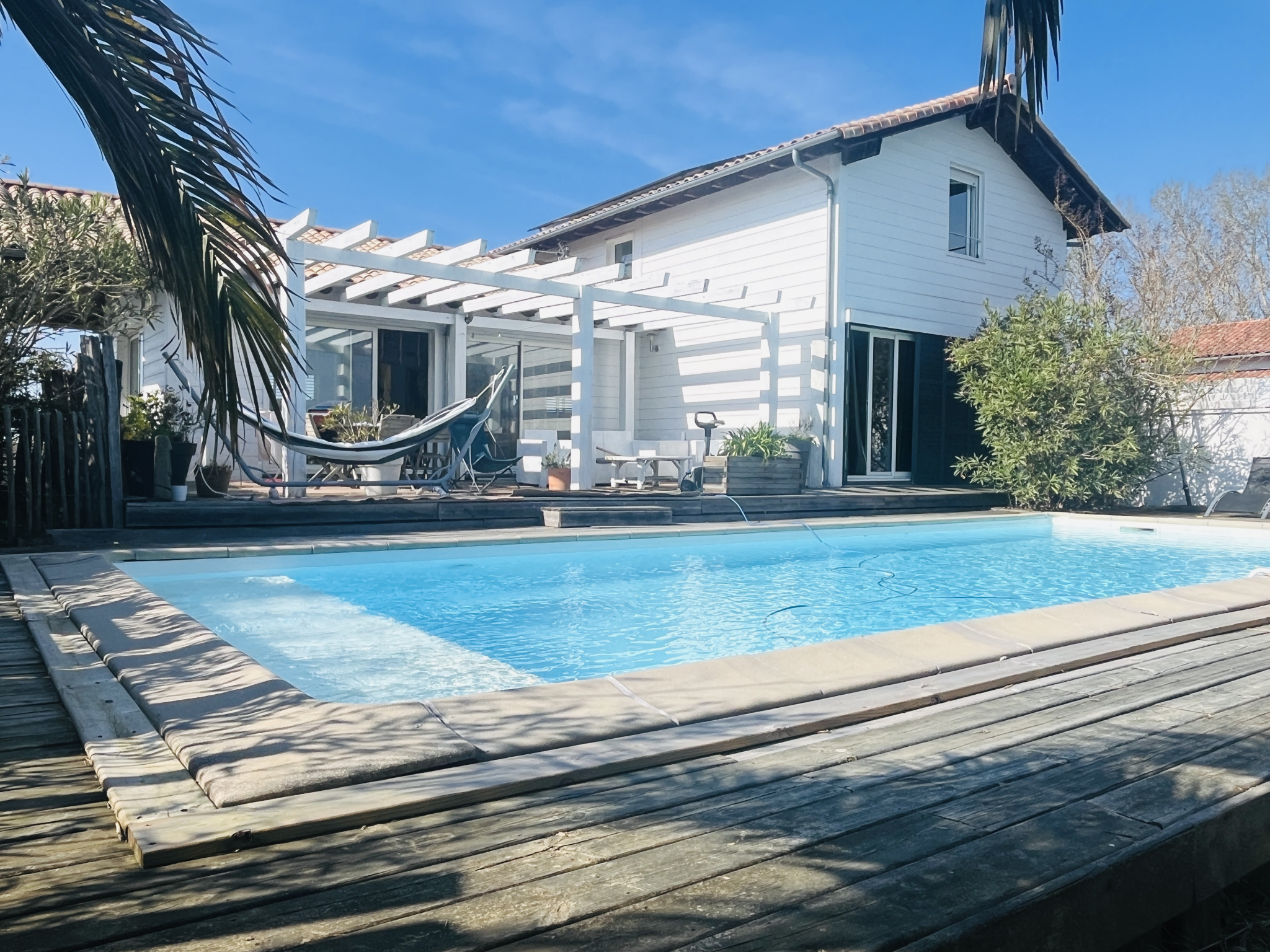 Édifiée sur une parcelle de 1 170 m², la propriété bénéficie d’un agréable espace extérieur avec piscine chauffée 10 x 4 m, à l’abri des regards, dans un cadre intimiste avec une superbe vue dégagée sur les montagnes.