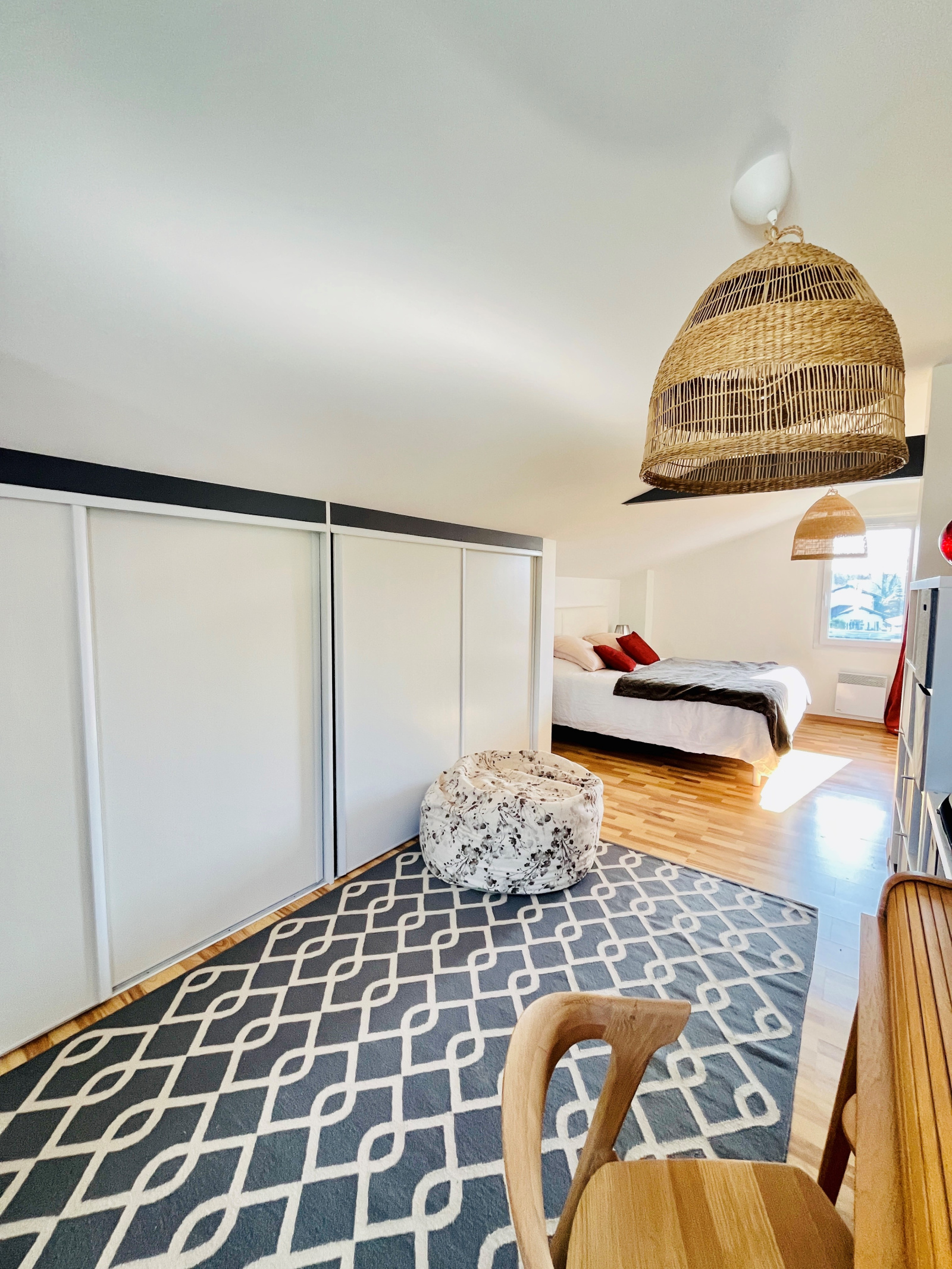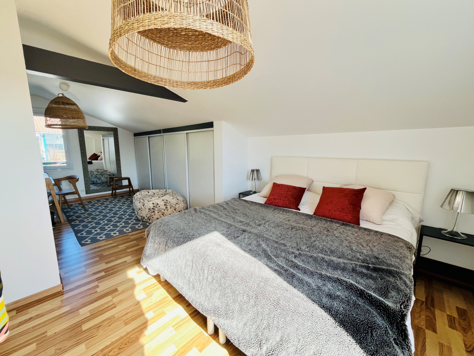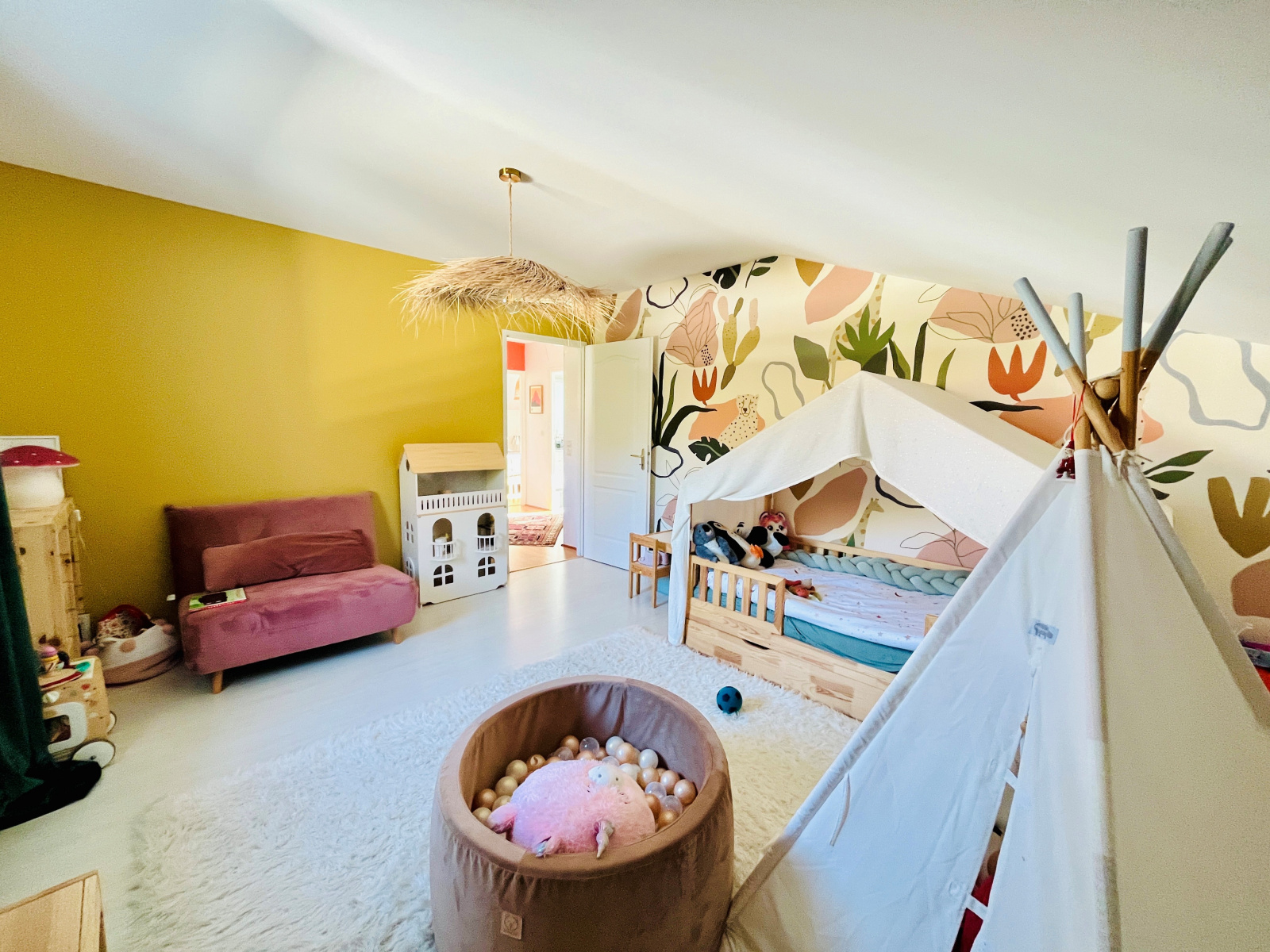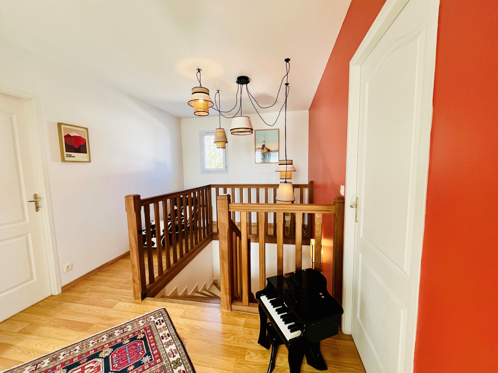 A l'étage une mezzanine servant de coin de détente, lecture, ses trois spacieuses chambres avec placards dont une avec un bureau, une salle d'eau et un WC , parfait pour accueillir une grande famille.